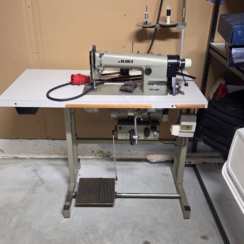 Viime vuosina vähälle käytölle jäänyt kone. Testattaessa teki tikkiä ja vaikutti muutenkin toimivalle, mutta en ole asiantuntija. Pöytään lisätty pyörät alle, mikä helpottaa siirtelyä ja levennysosan saa alas eli menee pienempään tilaan. Kuljetus läheseudulle onnistunee pakettiautolla.