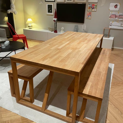 Tamminen ruokapöytä koko puuta, metallisilla ristikkojaloilla (musta).