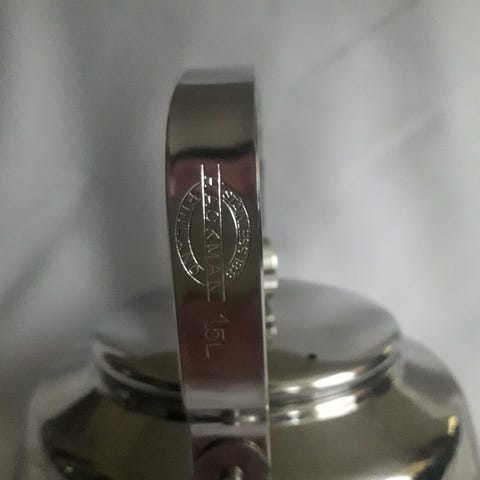 Vanha Nils Johan Hollywood -sarjan kahvipannu (Christina) ruostumattomasta teräksestä. Kahvan alaosasta lohjennut pala.