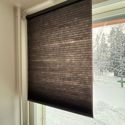 "Vedä kaihdin alas, jotta voit nauttia yksityisyydestä ja peittää häikäisevän auringonvalon. Päivänvalo suodattuu valkoisen kaihtimen läpi, ja huoneeseen leviää pehmeä valo."