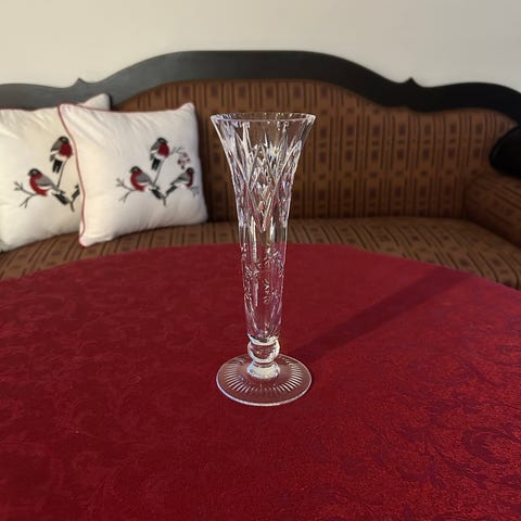 Virheetön/ehjä kristallimaljakko, korkeus 25 cm, yläosan ulkohalkaisija 12,4 cm, paino 1629g. Nouto tai voin toimittaa omien menojen mukaan Kvl-Lahti suuntiin, lähetys ostajan riskillä ja kustannuksella.