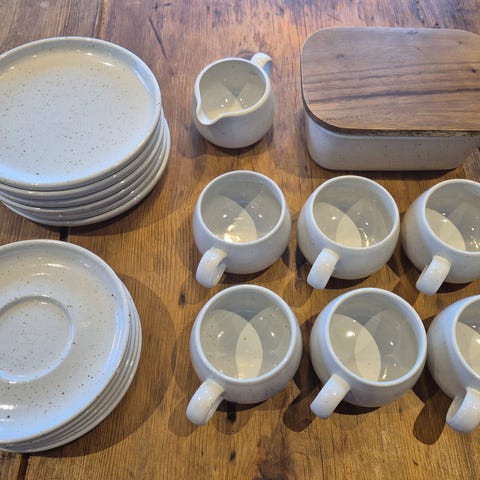 Yksittäisiä kahvikuppeja, mukeja ja lautasia.