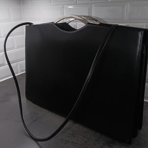 Marimekko vintage musta nahkalaukku valkoisiin ompelein, kulmissa havaittavissa käyttökulumaa, yleisilme kuitenkin ihan siisti. Mahtuu läppäri ym.