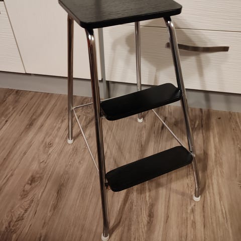 Porrasjakkara sopii kasvipidikkeeksi. Huojuva ei sovi istumiseen tai seisomiseen. Porrasjakkara Aarne. kork.62 cm, lev.35 cm, syv.49 cm.