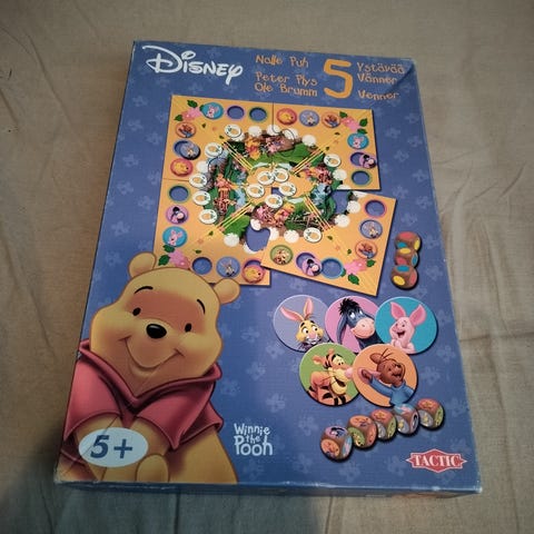 Nalle Puh pelisetti. Sisältää pelit Disney Choco ja Nalle Puh ja viisi ystävää. Chocosta puuttuu yksi pelinappula (ei vaikuta pelaamiseen) ja kansi on yhdestä kulmasta teipattu. Säännöt teipattu kanteen kiinni. Muuten pientä peruskulumaa laatikoissa, mutta muuten erittäin hyväkuntoiset pelit.