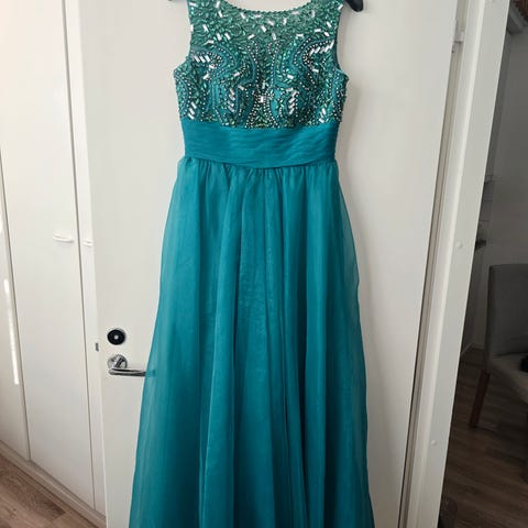 Uutena ostettu ja kerran käytetty kaunis vaalea hopeanharmaa vanhojentanssimekko, jossa yläosassa kirjailua. Ryhdikäs yläosa ja avoinainen selkä. Monikerroksinen tyllihelma, ei tarvitse alushametta. Kuvassa käyttäjän pituus 165cm.