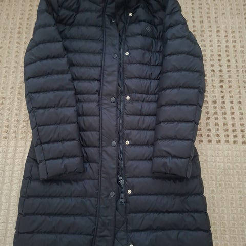 Gantin ihana untuvatakki. Kiinteä huppu, irrotettava tekokarva. Hihoissa resorit. Paljon taskuja. Vyötäröllä takin sisäpuolella kiristysnauha. Todella lämmin, muhkea untuvatäyte.