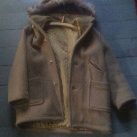 Lämmin takki. Nappien ympäriltä vähän pakkailtu vuorta.
