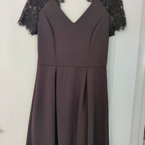 Dorothy Perkinsin musta mekko, jossa pitsiset olkapäät. Takana vetoketju ja pitsiosassa nappi. Pidetty yhdet juhlat, kubto ihan uudenveroinen. Materiaali antaa muutoin hyvin periksi ja on mukava päällä. Vastaa mielestäni hyvin kokoaan.