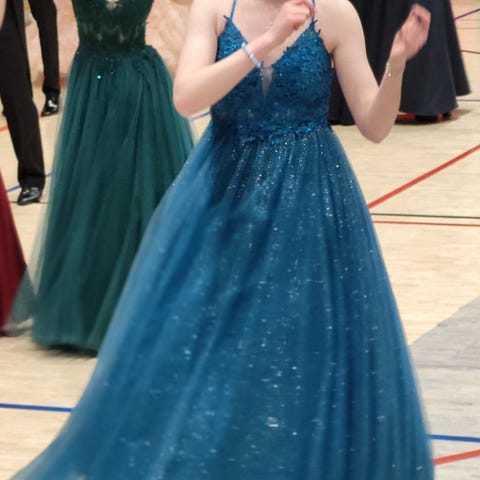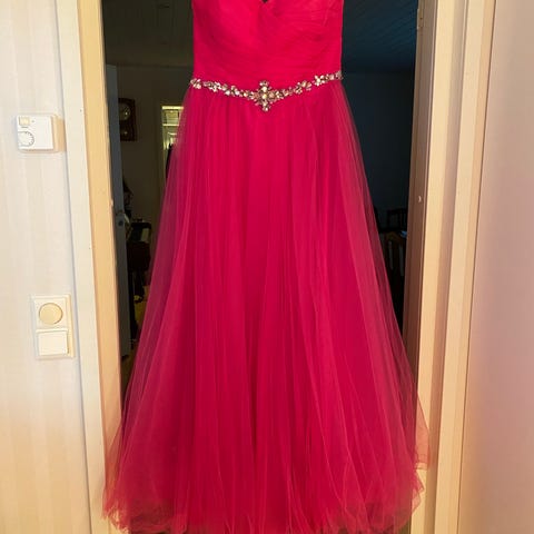 Upea vaaleansininen vanhojentanssimekko. Kunto hyvä. Vuorikankaan helmassa hieman likaa, joka ei näy ulospäin. Ollut käytössä 162 cm tanssijalla tennareiden kanssa ja hänelle mekko oli hieman liian pitkä. Selässä vetoketju. Vyötärönympärys n. 73 cm, rinnanympärys n. 94 cm. Eläintalous.