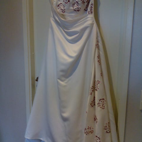 Ihana musta/punainen hääpuku, kahdella alushameella. Punaiset pitkät hanskat, punainen teddykeeppi satiini nauhoilla, Koriste hameessa irrotettavissa. Myös huivi. Ylellinen setti tästä yksilölliselle morsiamelle. Täysin käyttövalmiina, pukupussissa. Koko joustava, takana olevien nyörien avulla. 42-46, saa sovittaa. Ei postitusta