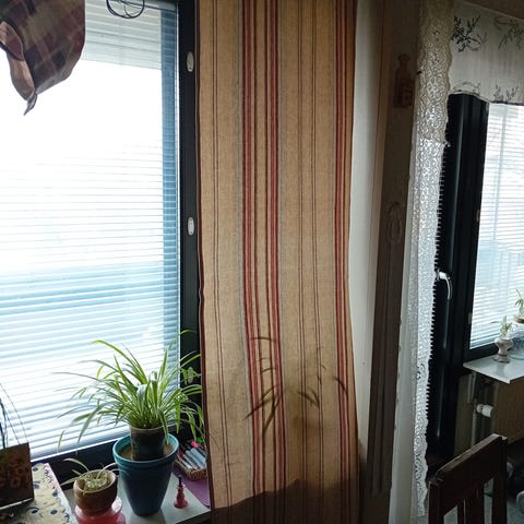 Tummanvihreä sivuverho, ohutta läpikuultavaa kangasta.