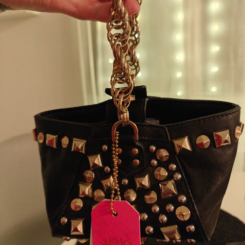Uusi ja käyttämätön (laput kiinni) Versace for H&m musta nahkalaukku kullan ja hopeanvärisin niittikoristein. Laukussa on magneettisuljenta. Mukaan dustbag.