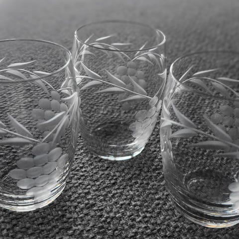 Kaunis snapsilasi, jonka kylkeen hiottu kuusen oksa ja kaksi käpyä. Korkeus 6 cm ja halkaisija 3.8 cm.