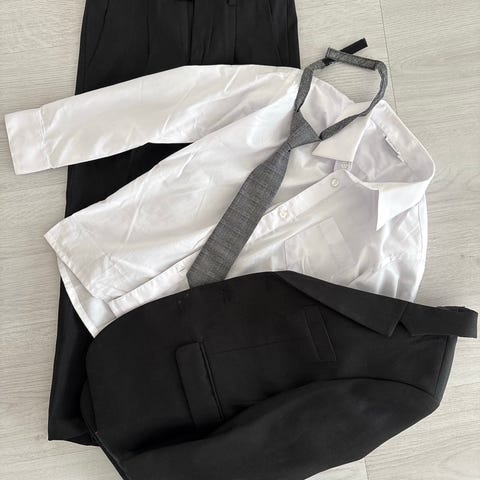 Kauluspaita 122cm ja suorat musta housut 128cm ja farkut 128cm. Siistejä kaikki.