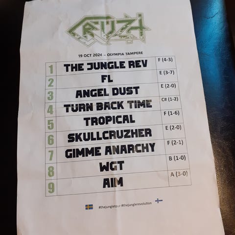 Kehystetty Ruoskan The Circuksen 22.10.2022 settilista nimmareilla. Karu kunto kertoo keikan kovasta menosta!