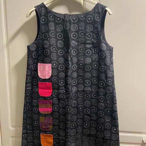 Ihana, vain muutaman kerran käytetty kelta-valkoinen kotelomekko. Alushame. Taskut. Napitus takana. Kuosi: Joonas