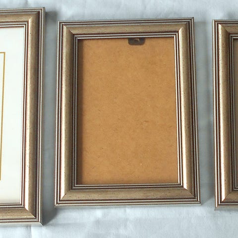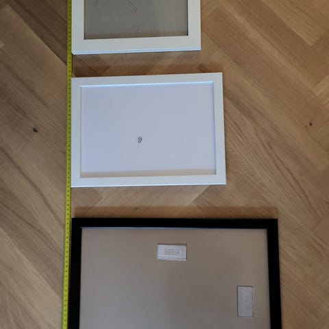 Kaksi hillitysti koristeellista valokuvakehystä. Molemmat vielä muoveissa.