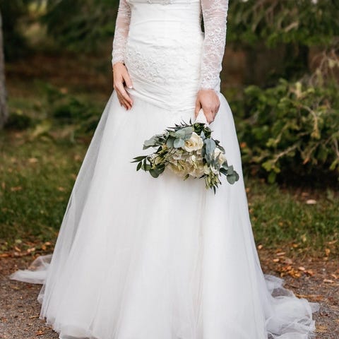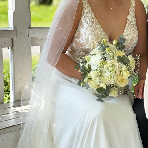 🩶Kerran käytetty kesällä -24, ostettu Bohola Bridal. Siellä ammattilainen lyhentänyt vain helman pituutta. Pesetetty käytön jälkeen.