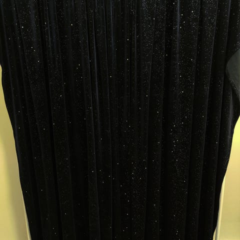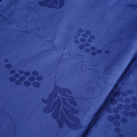 Lyhyeksi verhoksi ommeltu pala vihreää ruusukuvioista damastikudoksista puuvillakangasta. Palassa on ylhäällä rypytysnauha ja muilla sivuilla kapea päärme.