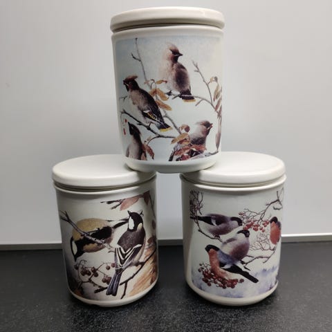 Kermansaven kaksi purkkia, vanhempaa tuotantoa. Suurempi, 1 litran purkki n. 14 cm korkea, pienempi noin 7 cm korkea.