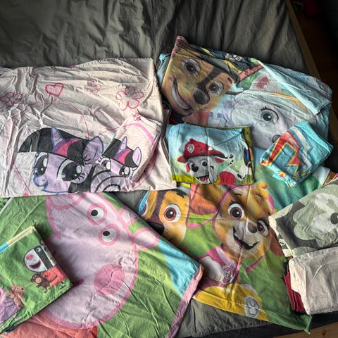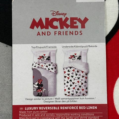 Myydään uutena ostettu, yhden lapsen käyttämä erittäin hyväkuntoinen ja siisti Mikki-Hiiri pussilakanasetti pinnasänkyyn. Tyynynliinan koko 45x35 ja pussilakanan koko 125x80. Pussilakanan helmassa nappikiinnitys.