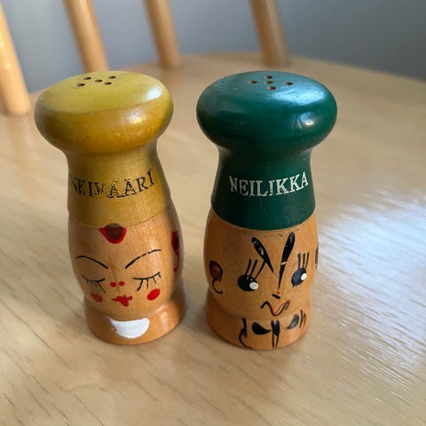 Hakusanat maustesetti mausteikko suola ja pippuri pippuriteline suolateline vintage sirottimet vintagekoriste