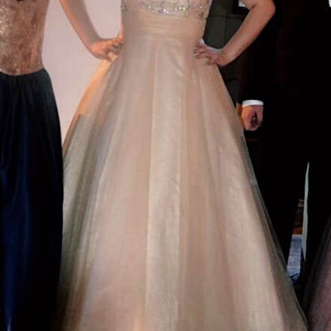 Upea vaalea väri ja hennosti sädehtivät paljetit yläosassa. Olkaimet säädettävissä pienellä ompeluhommalla omatoimisesti kumpaan suuntaan tahansa. Vetoketju selkäpuolella eli kokoa ei saa säädettyä. Hameessa on tyllin alle piilotettu halkio.