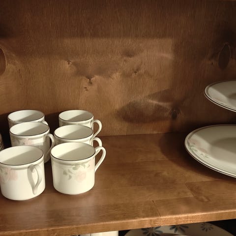 Pulla lautaset,sokeriklo,kermakko,kahvikuppi parit.Kaikkia 6 kpl. Ja iso lautanen halkaisijaltaan 24 cm.