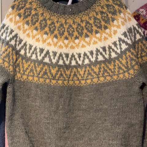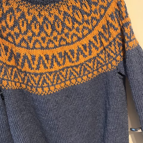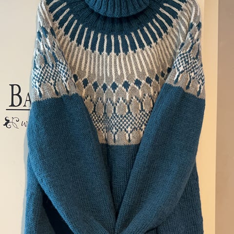 Aidosta villalangasta käsin kudottu villapusero. Saatu lahjaksi ja ei käytetty. Myyjällä pituutta 183 cm. Leikkaukset väljät. Menee varmaan 175 - 185 cm riippuen vähän kehon mittasuhteista. Kainalosta hihan päähän mitattu 50 cm ja kauluksen etureunasta helmaan 57 cm