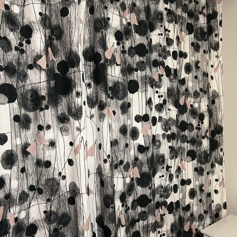 Kauniit Pentik Krysanteemi -kankaasta itse ommellut verhot tankokujalla
