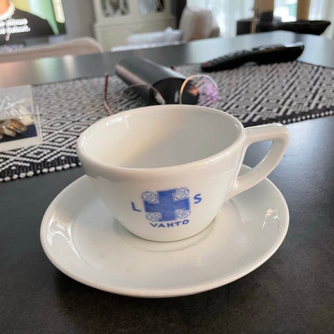 Myydään 4 settiä harmaita Arabian Sointu kahvikuppeja alus ja pulla lautasineen.