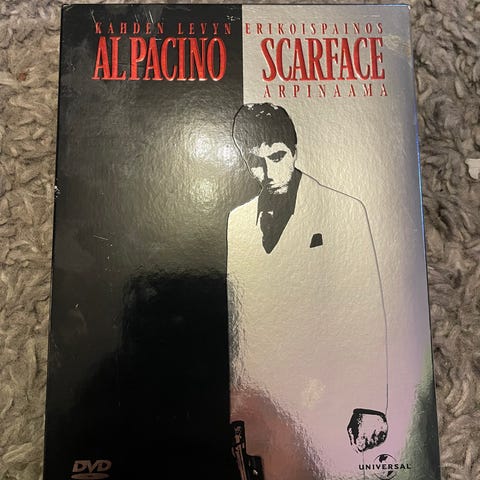 Myydään erittäin hyväkuntoiset Scarface vuodelta 1932 ja Al Pacinon two-disc anniversary edition Scarface 1983. Ensimmäinen on avaamaton. Naarmuttomat levyt.
