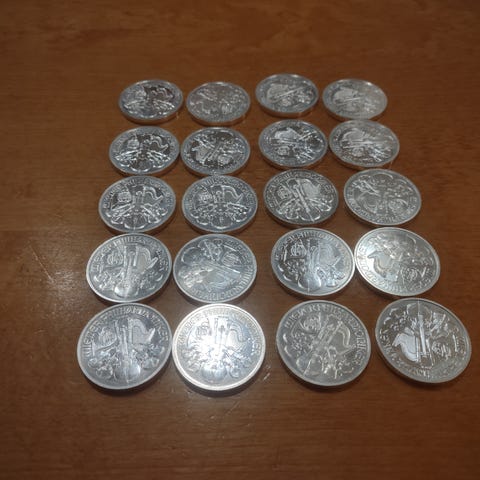 1 0z hopeakolikko 99,9% hopeaa, eli yksi unssi, tuolla myydään 1 oz kolikkoa 74e :llä