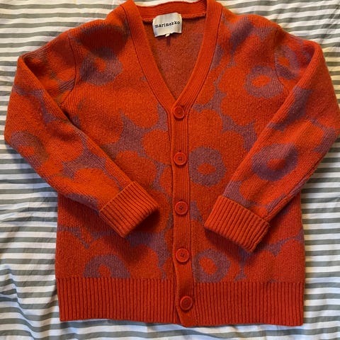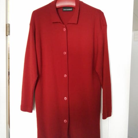 Kerran pidetty kaunis Marimekon beige pidempi neuletakki. Edessä napit, sivuilla taskut. 100% villa