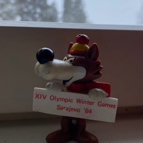 Vuonna 1980/82 valmistettu olympialaisdiguuri. Maalissa paikoin haalistumia. Tosi retro!