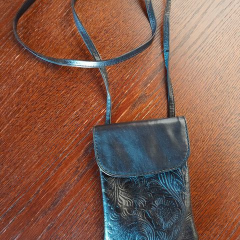 Käyttämätön pikku laukkunen. Läppä aito karva. Muuten en varma onko nahka vai tekonahka. Neppari kiinnitys. Koko 16×12,5cm. Hihna 120cm. Vintage
