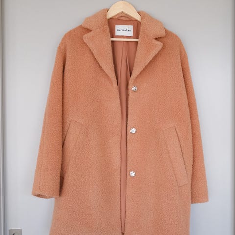 Villakangastakissa on piilotettu painonappikiinnitys . Takissa on sisävuori ja siinä on leveät taskut edessä.