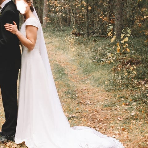 Puku ostettu Oulun Katariinasta vuonna 2018. Häiden jälkeen pesetetty pesulassa.