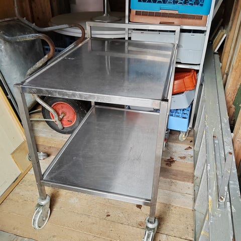 Metos tarjotinvaunu, kääntyvillä pyörillä joista 2 lukittavaa. Mekanismi toimii.