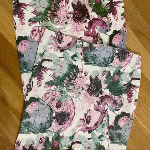 Tässä entisaikojen tunnelmallinen liina, jossa ruiskaunokki, apila, metsämansikka -kuvio yms. Hyväkuntoinen ja siisti. Koko n. 64x49 cm.