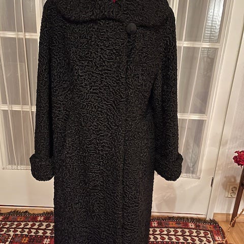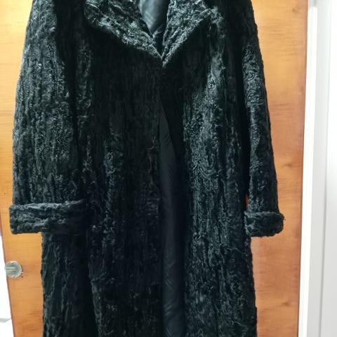 Iso-mummun aarteita 50-60-luvulta: Siisti ja ikäisekseen hyväkuntoinen musta VINTAGE krimiturkki. Havaitut puutteet listattu alla. Valmistaja Kruunuturkki. Sivutaskut. Vuori.