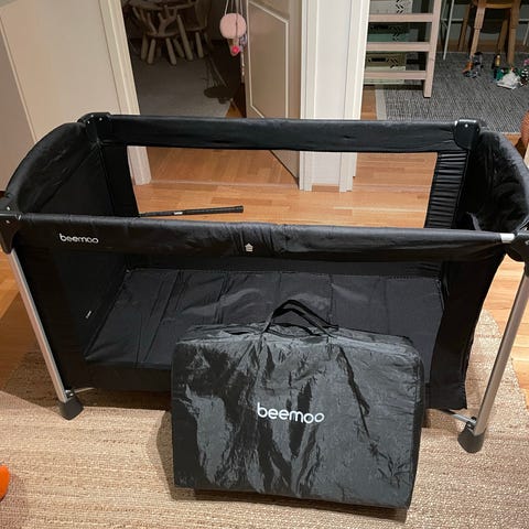 Toddler foldable travel bed. The mattress measures approx. 122 x 50 cm. Protective edges and very comfortable. Only used a few times. Can include travel bag and 5x fitted sheets.