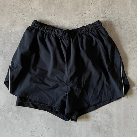 2 kertaa käytetyt, uudenveroiset shortsit. Sivuissa hieman läpikuultava yksityiskohta (näkyy kuvassa). Joustava vyötärönauha, sisäänommellut ”alushousut”, ei erillisiä taskuja. 92% polyesteria, 8% spandexia. Koko L, pituus 32 cm.