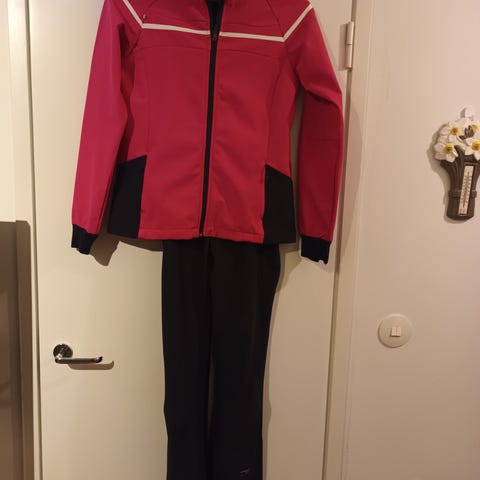 Koon M hiihtopuku. Takki ja housut henkseleillä.