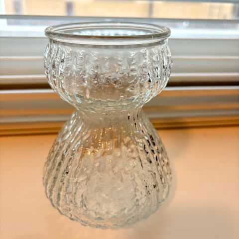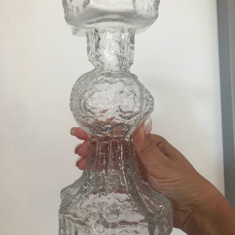 Myydään Nanny Stillin kirkas Kometti maljakko. Korkeus 18cm, leveys 19,5cm x 8cm. Valmistettu vuosina 1968-1969, valmistaja Riihimäen lasi.