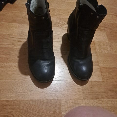 Mustat mattapintaiset (tekonahka) nilkkurit matalalla korolla. Lämmin teddyvuori. Hopeanväriset niittisomisteet ja vetoketjut.