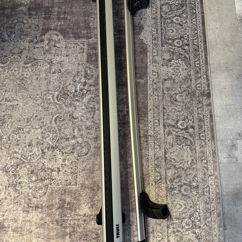 Thule Wingbar Evo -kattotelineet ja kiinnitystelineet (Thule Flush rale) autoon, jossa on kiinteä kiinnityspiste (ei siis kattokiskoja). Ollut käytössä MB C-sarjan sedanissa. Ostettu vuonna 2022. Telineiden pituus 118 cm.