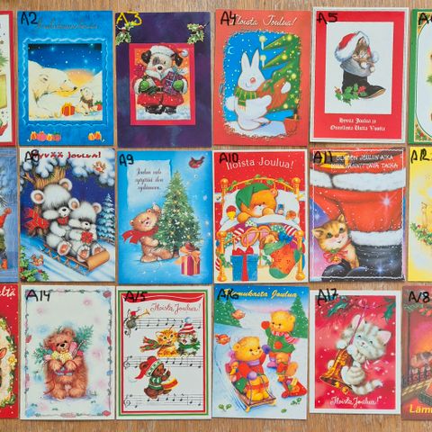 Kulkeneet joulukortit, Åsa Gustafsson, Eliasson. Ylimmässä kortissa tontut lumisessa maisemassa poron vetämän reen kyydissä. Pystykorteissatonttu istuu penkillä eläinten ympäröimänä ja viimeisessä kortissa eri ilmeisiä tonttujen kasvoja.