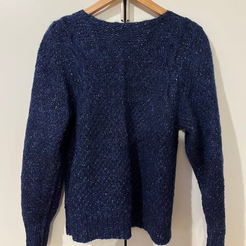 Myydään kaunis sininen neulepaita, jossa on värikkäitä pilkkuja. Paita on pitkähihaista mallia ja siinä on syvä V-pääntie. Materiaali on pehmeää ja mukavaa, ja se sopii hyvin viileämpiin päiviin. Neulepaita on erittäin hyvässä kunnossa ja täydellinen lisä vaatekaappiisi!